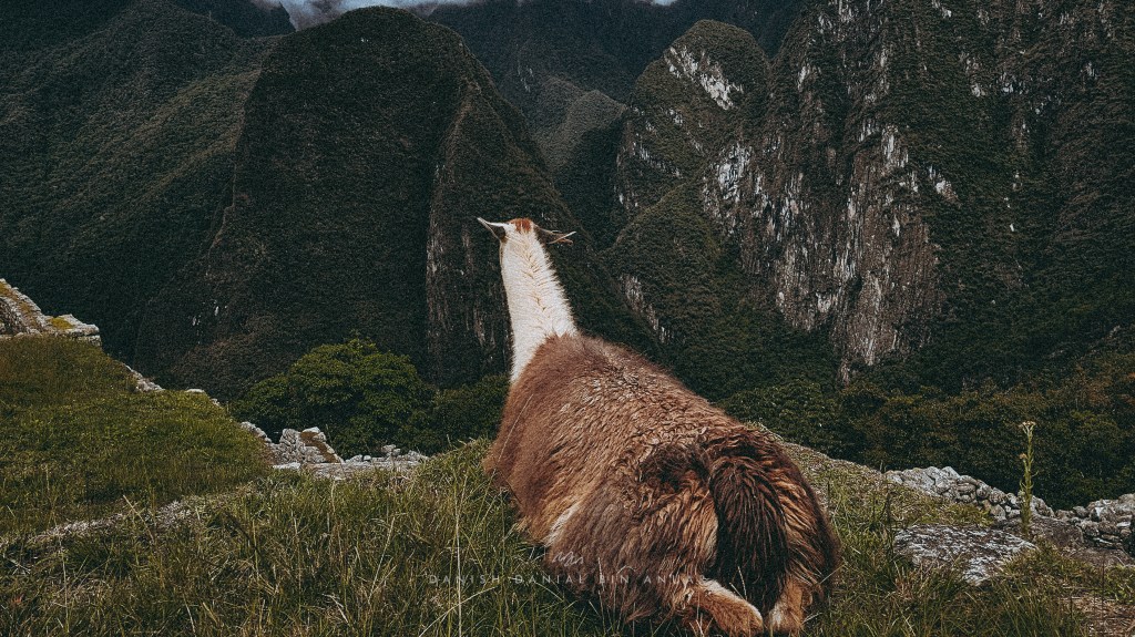 We got a shuttle up to the ruins of Macchu Picchu and had Antonio, a guide we scouted for at the base to guide us around. Impression – he’s the kind of guy I’d love to have to be my bedtime story reader and made our tour so much better. We learnt quite a lot of fun facts about the city; how this city mainly served the nobles of the empire including royalty, astronomers, and artisans, the fact that this city was left intact because it was never discovered by the Spanish, and how intricate the brick walls denote how important the building was. You could see the difference between houses where the blocks were just mushed together, and buildings that were built nicely. I was mind blown that it takes 1.5 months to carve a standard-sized block. There was a plaza where you would clap and it would echo back. Had a bit of fun clapping as everyone else followed suit. Also got to meet up close the resident Llamas with all the arching hills in the background. This one looked like a chicken drumstick.